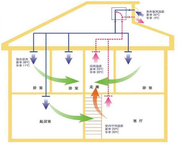 其次,我们来看看新风系统。对于新风系统来说,它的核心在于使室内空气和室外空气进行置换和形成对流。一般情况下,我们使用中央空调的时候都需要关紧门窗,那么在封闭的空间中就会出现二氧化碳浓度偏高,或者是氧气浓度偏低等问题。而新风系统就是这一问题的克星。新风系统的优点如下: